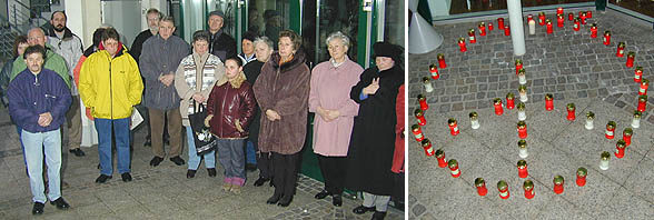 Eine Minute fest an den Frieden glauben Rund 40 Teilnehmer waren heute bei der Mahnwache für den Frieden vor dem Rathaus in Strümpfelbrunn versammelt. Mit Grablichtern formierte man das Friedenszeichen. (Fotos:Baumgartner) (tb) Zu seiner dritten Mahnwache für den Frieden hatte heute der SPD-Ortsverein Waldbrunn vor das Rathaus in Strümpfelbrunn eingeladen. Mit Lichtern wollte man auch an diesem Abend ein Zeichen setzen und formierte das weltweit bekannte Friedenssymbol. Vorsitzender Wilfried Münch warnte in einer kurzen Ansprache vor dem drohenden Krieg im Irak, der eine humanitäre Katastrophe für die Zivilbevölkerung nach sich ziehen würde. Es gebe keinen Zweifel, dass man den Irak mit seinem Diktator Saddam Hussein entwaffnen müsse, sagte Münch dabei. Doch hoffe man, dass sich dies auch friedlich bewerkstelligen lasse, was die Arbeit der Chefinspektoren Hans Blix und El Baradei zeige. Abschließend forderte Münch die rund 40 Teilnehmer dazu auf, eine Minute lang still zu halten und fest daran zu glauben, dass der Irak-Konflikt auch friedlich gelöst werden könne.