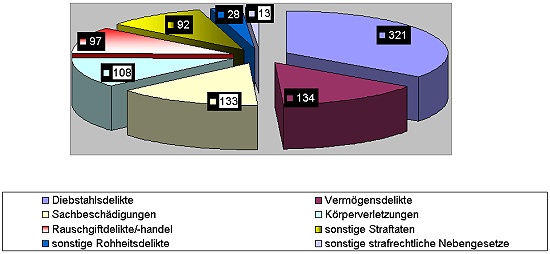 Die meisten Straftaten waren Diebstähle (34 Prozent), gefolgt von Sachbeschädigungen, Rohheits- und Vermögensdelikten mit einem Anteil von jeweils rund 15 Prozent. 10 Prozent der Straftaten in 2002 gehörten zur Rauschgiftkriminalität.