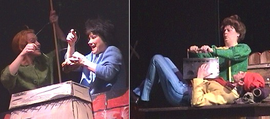 Max und Moritz und ihre sieben Streiche (Fotos:C.Richter)(hr) (cr) Trotz schönem Wetter fanden gestern Nachmittag etwa 300 Menschen den Weg in die Eberbacher Stadthalle, um sich die Streiche von Max und Moritz anzusehen. Das Kinder- und Jugendtheater aus Arlesheim (Schweiz) war auf Einladung des Kulturamtes zu Gast und ließ die alte Geschichte von Wilhelm Busch wieder aufleben. Die Frau des Schneiders Böck (Birgit Freitag) führte durch das Programm, erzählte den Anwesenden was alles noch passieren wird und erwartete von Kindern, Eltern und Großeltern lautstarke Antworten auf ihre Fragen. Alle Schauspieler und Schauspielerinnen spielten ihre Rollen überzeugend, die Kostüme waren stimmig, und um die verschiedenen Streiche gut darstellen zu können, war immer das passende Bühnenbild vorhanden. Letzteres sorgte für viele Umbaupausen, in denen die Kinder ungeduldig auf die nächste Szene warteten. Und wie in einem "echten" Theater üblich, war natürlich für Bewirtung durch die Mitarbeiterinnen des Kulturamtes gesorgt.