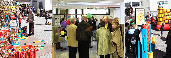 Reger Zuspruch bei Tag der offenen Tür (Fotos:Claussen)(jc) Regen Zuspruchs erfreute sich heute der Tag der offenen Tür bei der Sparkasse in Eberbach. Ein Blick hinter die Kulissen in der bereits am 24. Februar nach erfolgtem Umbau wiedereröffneten Eberbacher Hauptstelle der Sparkasse Neckartal-Odenwald lockte bei herrlichem Frühlingswetter zahlreiche Besucher in die Innenstadt. Jeder Besucher erhielt ein Präsent und einen Verzehrgutschein. Die kleinen Besucher erwartete ein Spielparcours und eine Hüpfburg auf dem Parkplatz hinter dem Gebäude. Das Sparkassenteam erläuterte die Einrichtungen im neugestalteten Servicebereich.