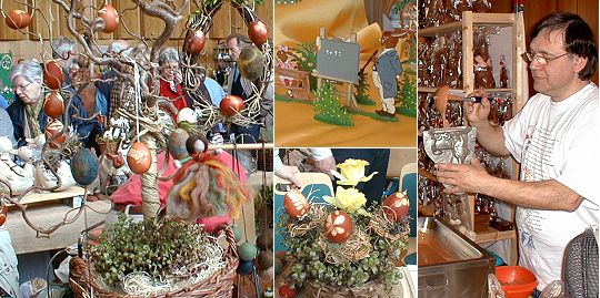 Alles für die Osterdekoration (Fotos:C.Richter)(hr) (cr) Noch drei Wochen sind es bis Ostern - alles rund ums Thema gibt es bereits heute und morgen im Großen Saal der Stadthalle Eberbach beim traditionellen Ostereiermarkt des Bürger- und Heimatvereins zu sehen. Neues und Altbewährtes zeigen die etwa 45 Aussteller aus dem ganzen Bundesgebiet. Im Mittelpunkt stehen Eier in allen Variationen, aber auch die österliche Tierwelt ist vertreten: Der krähende Hahn und die frisch geschlüpften Küken sorgen genauso für Aufsehen wie die "Osterhasengießerei" der Familie Hellmann. Mit Gießformen ab dem Ende des 18. Jahrhunderts bis heute wird die historische Entwicklung der Schoko-Hasen erkennbar.