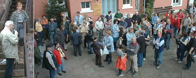 Auf den Spuren des Bärlauchs Die Bärlauch-Wanderer vor dem Abmarsch an der Tourist-Information, links Werner Helm und Marlene Müller bei der Begrüßung. (Fotos:C.Richter)(hr) (cr) Bei sonnigem Wetter fanden sich heute Nachmittag über 100 Wandersleute bei der Tourist-Information in Eberbach ein, um im Rahmen der Eberbacher Bärlauchtage 2003 bei der ersten geführten Wanderung in die Bärlauchbestände teilzunehmen. Werner Helm von den Bärlauch-Aktiven begrüßte die Gäste, die teilweise weit angereist waren, um an dieser Veranstaltung teilnehmen zu können. Nach einer schönen Wanderung kam man auch bald in den ersehnten Bärlauchbeständen an. Marlene Müller, Heilpraktikerin und Kräuterfrau aus Zwingenberg, erzählte Interessantes über die Heilwirkung dieser Kräuter, aber auch über Bärlauch als Gewürzpflanze und als Wildgemüse. Dass Bärlauchsammeln nicht ganz ungefährlich sein kann, bewies sie durch den Vergleich mit der Herbstzeitlosen. Mit diesem Fachwissen durften die Teilnehmer nach Herzenslust Bärlauch ernten.