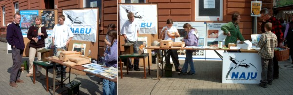 Eberbacher Naturschutzjugend stellt sich vor Die Naturschutzjugend und Mitglieder des Naturschutzbundes Eberbach stellten ihr Jahresprogramm 2003 vor. (Fotos: Böhm)(ub) Mit einem eigenem Stand war die NABU- Gruppe Eberbach des Naturschutzbundes Deutschland e.V. am Samstag auf dem Leopoldsplatz vertreten. Die Kinder- und Jugendgruppe Eberbach – kurz Naturschutzjugend (NAJU) genannt- wird in diesem Jahr viele interessante Exkursionen und Aktionen durchführen. Die Kindergruppe führt Pilzwanderungen, Waldführungen, Aktionstage durch und nimmt am Hoffest und Apfelsaftpressen auf dem Demeter- Hof im Breitenstein und an der Batnight mit Aktionen rund um die Fledermaus teil. Die Jugendgruppe erkundet die Naturgeschichte des Vulkans auf dem Katzenbuckel, fährt in ein Pfingstlager, baut eine Waldhütte, kümmert sich um die Pflege von Biotopen und führt neben Wanderungen auch eine Kanufahrt auf dem Neckar durch. Der Jahresbeitrag für die Kindergruppe beträgt 10 Euro pro Kind. Familien mit zwei oder mehreren Kindern zahlen pauschal 15 Euro. Viele weiteren Informationen zum Jahresprogramm 2003 sind über die jeweiligen Ansprechpartner zu erhalten.