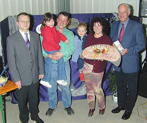 Landmetzgerei Großkopf in Lauerskreuz wiedereröffnet Unser Foto zeigt links Manfred Leitheim, Wirtschaftsbeauftragter des NOK, sowie Sandra Nerbel mit Ehemann und rechts Bürgermeister Peter Kirchesch vor einem Büffet mit Wurstspezialitäten aus der Hofmetzgerei Großkopf in Lauerskreuz. (Foto: Baumgartner)