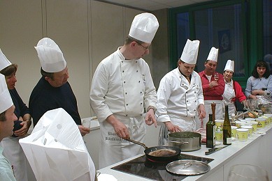 Neue Bärlauch-Kochexperten in Eberbach Die Küchenmeister Rolf Uhrig und Uwe Jung (Mitte v.l.) gaben Tipps und Kniffe fürs Kochen mit Bärlauch. (Foto:C.Richter)(hr) (cr) Anlässlich der Eberbacher Bärlauchtage fand vorgestern Abend in der Realschule ein Kochkurs mit Bärlauch statt. Insgesamt 24 Teilnehmer, die aus Eberbach, aber auch von außerhalb - beispielsweise aus Eckernförde, Hamburg, Koblenz, Berlin und Bruchsal - kamen, wurden von den beiden Küchenmeistern Uwe Jung (Hotel Krone Post) und Rolf Uhrig (Gasthaus Kühler Krug) mit einem Glas Sekt begrüßt. Zuerst durften alle an einem Küchenquiz teilnehmen, dann gab es schon richtig viel zu tun. Es wurde Bärlauch geschnitten, Eier verrührt, Zutaten zu Pesto püriert, und anschließend konnten alle Gerichte probiert werden. Verkostet werden konnten Bärlauchcremesuppe, Bärlauchkäsespätzle mit Schweinefilet, Terrine von Bärlauchmousse und gebeiztem Lachs und viele andere interessante Gerichte um den Bärlauch. Zum Essen wurde natürlich ein "Bärlauch"-Wein gereicht, dies stand jedenfalls so auf dem Etikett. Die Stimmung war ausgelassen, kein Wunder: Ein Teil der "Jungköchinnen" und "Jungköche" machte schließlich wegen der Eberbacher Bärlauchtage hier Urlaub. In Kürze findet noch ein weiterer Kochkurs statt, welcher aber schon ausgebucht ist. Die beiden Küchenmeister sind sich einig: "Wir hätten noch vier Kurse anbieten können".