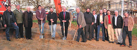 Neues Baugebiet kostet rund 450.000 Euro Unser Foto zeigt im Neubaugebiet der Gemeinde Neckargerach den 1. Spatenstich durch Bürgermeister Peter Kirchesch(Bildmitte), die Ingenieure Dirk Lysiak und Martin Zietsch (Ing. Büro für Kommunalplanung), sowie Geschäftsführer Edwin Fehr (Meny-Bau, Mosbach), zusammen mit Mitgliedern des Neckargeracher Gemeinderates. (Foto: Baumgartner)