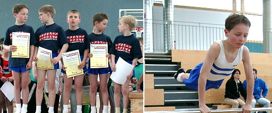 Eberbacher Jungs können sehr zufrieden sein TVE- Mannschaft und Tino Broghammer am Reck (Fotos:privat)(jc) (jl)Einen ihrer erfolgreichsten Tage hatten jetzt die Gerätturner der männlichen E-Jugend des TVE (Nikolai Wollkopf, Fabio und Tino Broghammer, Lars Springer und Dominik Köhler). Gestern fanden in Tauberbischofsheim die Finalkämpfe der Mannschaften der Turnerinnen und Turner statt. Die Jungs haben hier eine sehr gute Saison mit einem hervorragenden 3. Platz abgeschlossen. Die Fahrkarte zu dem Endkampf für den sich auch sieben weitere Mannschaften aus den Kreisen Sinsheim, Heidelberg, Mannheim und Main- Neckar qualifiziert hatten, erkämpften sich die Eberbacher Nachwuchsturner auf heimischen Boden als am 16.März die Mannschaftsentscheidungen im Kreis Heidelberg anstanden. Bei der Entscheidung auf Kreisebene mussten sich die Eberbacher nur der Mannschaft des Heidelberger TV geschlagen geben. Leider war die turnerische Leistung des HTV auch im Finale nicht zu überwinden und so siegte dieser mit über zwei Punkten Vorsprung vor dem TV Mannheim Neckarau, der wiederum nur 0,4 Punkte vor unseren Turnern auf Platz 2 kam.
