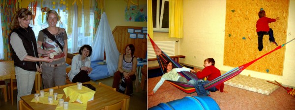 Bewegungsraum mit Kletterwand als besondere Attraktion Die Leiterin des Kindergarten Regenbogen stellte die neuen Räumlichkeiten vor. (Fotos: Böhm)(ub) Der Kindergarten Regenbogen in der Bussemerstraße lud heute zum Tag der offenen Tür ein. Auf die Förderung der eigenen Sinneswahrnehmung und Stärkung der Eigenständigkeit der Kinder wird im Kindergarten Regenbogen besonderen Wert gelegt. Für die Eltern wurde in den Kellerräumen ein Treffpunkt eingerichtet, der auch als Besprechungsraum genutzt werden kann. Die Kleinen turnen künftig im Bewegungsraum an allerlei Geräten herum. Eine besondere Attraktion, so Leiterin Ingrid Schuh, ist eine Kletterwand, an der die Kindergartenkinder ihre motorischen Fähigkeiten üben können. Einmal wöchentlich schaut Marita Hech vorbei und nutzt diesen Raum zur Sprachförderung ausländischer Kinder. Zielgruppe sind Schulanfänger, denen der Einstieg ins Schulleben mit besseren Sprachkenntnissen erleichtert werden soll. Im ersten Obergeschoss lockt eine Kinderbibelausstellung, in der die unterschiedlichsten Kinderbibeln zu betrachten sind. Viele Besucher kamen bereits morgens zum Brunch ins Evangelische Gemeindehaus. Nachmittags gab es Kaffee und Kuchen. Auf dem Spielplatz des Kindergartens konnten die zahlreichen Besucher an einer Tombola teilnehmen.