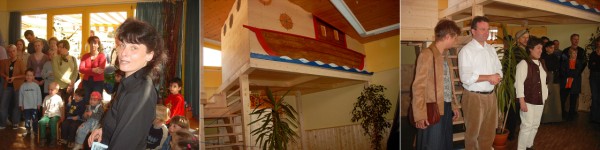 Mein Papa hat auch geholfen Carmen Schreiber- Sohns, Leiterin des KiGa Arche Noah, freute sich mit den Gästen über die gelungene Inneneinrichtung. Bürgermeister Bernhard Martin und Dekanin Hiltrud Schneider -Cimbal eröffneten die neue Ebene offiziell. (Fotos: Böhm)(ub) Dank der Unterstützung von 16 Eberbacher Firmen und der Stadt Eberbach war es heute möglich, ein großes Einweihungsfest im Kindergarten ARCHE NOAH zu feiern. Nach einem gemeinsamen Familiengottesdienst in der Michaelskirche mit dem Kindergarten Regenbogen lud Leiterin Carmen Schreiber- Sohns zur Einweihungsfeier der zweiten Ebene der Elefantengruppe ein. Viele Kinder kamen mit ihren Eltern und Großeltern, die bereits auch bei den Renovierungsarbeiten geholfen hatten. Ein besonders stolzes Kind rief sogar "Mein Papa hat auch geholfen". Die beiden Erzieherinnen der Elefantengruppe, Frau Schnitzhofer und Frau Druschbin, hatten zur offiziellen Eröffnung ein Begrüßungslied und ein Lied über die Arche Noah einstudiert. Dekanin Hiltrud Schneider- Cimbal sprach einen besonderen Dank für die finanzielle Unterstützung an Bürgermeister Bernhard Martin und die beteiligten Firmen wie beispielsweise das Autohaus Lessle, die Firmen Heizöl Kappes und Reibel sowie die Krankengymnastin Helga Volk aus. Mit Hilfe von Bernd Safferling sei es möglich gewesen, die Holzarbeiten der zweiten Ebene durchzuführen. Die Gestaltung der zweiten Ebene, so Schreiber- Sohns, orientiert sich am Schiff Arche Noah. Bürgermeister Bernhard Martin begrüßte die "Elefanten" und ihre Verwandten. Er wünschte den Kindern viel Spaß in der neuen Etage und freute sich über die neu hinzugewonnenen Rückzugsmöglichkeiten der Kleinen. Ein Ostermarkt mit vielen handgearbeiteten Basteleien war eine weitere Attraktion des Festes. Strahlender Sonnenschein lockte manchen Besucher bei Kaffee und Kuchen in den Außenbereich des Kindergartens.