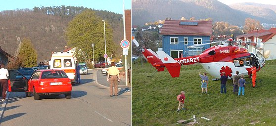 Fünfjähriger lebensgefährlich verletzt (Fotos:Böhm)(hr) Lebensgefährlich verletzt wurde ein fünfjähriger Junge, als er gestern Abend kurz nach 18.30 Uhr auf der Schwanheimer Straße vor ein Auto lief. Der Bub war nach den bisherigen Ermittlungen unvermittelt und für den Autofahrer nicht vorhersehbar hinter einem am rechten Fahrbahnrand parkenden PKW auf die Fahrbahn gerannt, von dem Audi erfasst und auf den gegenüberliegenden Gehweg geschleudert worden. Dort blieb er mit schweren inneren Verletzungen bewusstlos liegen. Bis wenige Minuten später die Notärztin eintraf, reanimierte der Autofahrer das Kind. Aufgrund seiner lebensgefährlichen Verletzungen wurde der Junge zunächst mit einem Rettungswagen in die Akazienstraße gefahren, von wo aus er in dem neben dem Kinderspielplatz gelandeten Rettungshubschrauber in eine Heidelberger Klinik geflogen wurde.