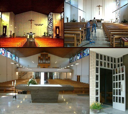 Großes Engagement aller Beteiligten bei den Renovierungsarbeiten St.Josef vor der Innenrenovierung (o.l.), Handwerker bei letzen "Feinarbeiten" in der "neuen" Kirche. Blick vom Altar auf die Empore und den neuen Andachtsraum, der durch ein Schiebegitter vom Kirchenschiff abgetrennt aber durch eine separate Eingangstür (u.r.) immer betreten werden kann. (Fotos:Rumstadt/Wörner)(tw) Letzte Arbeiten erledigten die Handwerker in den vergangenen Tagen in der Kirche St. Josef. Das Gros der Arbeiten war termingerecht schon zum Palmsonntag abgeschlossen, an dem die Gemeinde nach fünf Monaten den ersten Gottesdienst in ihrer neu gestalteten Kirche feiern konnte. Seit Beginn der Renovierungsarbeiten am 17. November vergangenen Jahres fanden alle Gottesdienste im sehr schön hergerichteten Pfarrsaal in der "Unterkirche" von St. Josef statt. Während dieser Zeit wurden die Renovierungsmaßnahmen fast ausschließlich von Firmen aus der Region durchgeführt. Dank des überdurchschnittlichen Engagements aller Beteiligten und der umsichtigen Bauleitung von Heinz Lang vom federführenden Architekturbüro Rumstadt in Eberbach konnten trotz einiger nicht erwarteter Schwierigkeiten alle Arbeiten termingerecht fertiggestellt werden. So musste zum Beispiel der Parkettboden unter den Sitzbänken komplett erneuert werden. Der dadurch entstandene Mehraufwand an Zeit und Geld konnte jedoch ohne Mehrkosten aufgefangen werden und der berechnete und genehmigte Kostenrahmen von 377.000 Euro wurde eingehalten. Von den Renovierungskosten sind etwa 40 Prozent als Eigenmittel von der Pfarrei St.Josef aufzubringen. Tatkräftige Unterstützung leistet hierbei unter anderem der Bauförderverein der Pfarrgemeinde. Darüber hinaus hat die Gemeinde für das laufende Jahr noch verschiedene Aktionen vorgesehen. Außerdem gab es zahlreiche ehrenamtliche Hilfe durch Gemeindemitglieder. So erbrachten sie zum Beispiel beim Ein- und Ausräumen der Kirche, bei immer wieder anstehenden Reinigungsarbeiten, beim Ab- und Antransport der Sitzbänke und beim Materialtransport erhebliche Eigenleistungen. Um die empfindliche Orgel während der Renovierung zu schützen, wurden zum Teil Orgelpfeifen ausgebaut und staubgeschützt gelagert. Das Gehäuse der Orgel wurde staubdicht verpackt. Auch hierbei halfen Gemeindemitglieder kräftig mit. Nach Abschluss der Arbeiten wird deutlich, wie sehr sich das Innere der Kirche verändert hat. Die ausgeführten Arbeiten gehen weit über kosmetische Maßnahmen hinaus. Seitenwände, Rückwand, Emporenbrüstung und Emporenuntersicht wurden gesäubert und neu gestrichen. Die Beschallungsanlage wurde erneuert und das neue Lichtschienensystem bietet vielfältige Möglichkeiten der Beleuchtung. Die Altarraumrückwand bekam eine senkrecht gestaffelte Vorsatzwand. Diese Vorsatzwand gliedert die große Fläche der Rückwand und schafft zugleich eine Nische für das große Hängekreuz. Der gesamte Chorraum wurde neu gegliedert. Die Kommunionbänke und die Altarstufen wurden abgebaut. Die gesamte Anlage der Chorraumstufen wurde so geändert, dass eine ebene Fläche um den Altar entstand. Der vorhandene Altar aus Naturstein war bislang auf einem Podest an der Rückwand des Chorraums aufgestellt. Er wurde zum Kirchenraum hin verschoben und dient nun wieder als Zelebrationsaltar. Für den Tabernakel haben die Architekten Gustav und Ulrich Rumstadt eine neue Stele aus Naturstein und Stahl entworfen . Durch die neue Anordnung der Stufen zwischen Kirchenschiff und Chor konnte der Altar näher an die Bankreihen gerückt werden. Die Sitzbänke wurden überarbeitet und gepolstert, die Bankanzahl wurde verringert und die Bankabstände wurden vergrößert um mehr Beinfreiheit zu bieten. Übrigens steht momentan noch unter dem Aufgang zur Empore eine der alten Sitzbänke - ein interessantes "Vorher-Nachher-Erlebnis", darauf Platz zu nehmen. Auf der rechten Seite wurden die Stufen so angeordnet, dass auf der Ebene des Kirchenschiffes eine Nische für das Taufbecken entstand. Das vorhandene Taufbecken wurde vom Eingangsbereich zu dieser neuen Taufanlage hin verschoben. Anstatt der Taufkapelle im Eingangsbereich gibt es jetzt dort eine Andachtskapelle mit eigenem Zugang von außen. Dieser neue Andachtsraum lädt die Gläubigen tagsüber zum Gebet und zur inneren Einkehr ein.