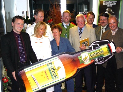 Bierwochen eröffnet: Bis 11.Mai Kulinarisches rund um den Gerstensaft Bei der Eröffnung der Beerfelder Bierwochen reihten sich die Veranstalter und Ehrengäste um das Grundprodukt: v.l. Armin Beisel, Hotel "Gasthof Hirsch" aus Rothenberg, Gabi Denniger, Landgasthof "Grüner Baum" aus Gammelsbach, Karl-Heinz Kroll, "Waldgasthof Reußenkreuz" aus Sensbachtal, Annette Bartmann, Landgasthof "Raubacher Höhe" aus der Raubach, Brauereichef Andreas Schmucker, Landrat Horst Schnur, Verkehrsbüroleiter Klaus Johe, Claus Denniger, Gasthaus "Zum Schützenhof" aus Beerfelden, und Otto-Heinrich Sattler als Vertreter des Hotel- und Gaststättenverbandes Odenwald. (Foto:privat)(tw) (kj) Zu den dritten Beerfelder Bierwochen laden seit vergangenem Mittwoch bis zum 11. Mai acht Gastronomen im Beerfelder Land. Dabei bieten sie rustikale und feine Speisen, zubereitet mit Beerfelder Bierspezialitäten. Am "Tag des Deutschen Bieres" – dem 23. April - wurden die Wochen offiziell eröffnet. Repräsentanten des öffentlichen Lebens und viele Medienvertreter waren in das Sensbachtaler Hotel "Waldgasthof Reußenkreuz" gekommen, wo ihnen ein Einblick in die Vielfalt der kulinarischen Ideen der Köche im Beerfelder Land gegeben wurde. Landrat Horst Schnur beglückwünschte die Akteure, die zum einen beweisen, dass solche Kooperationen wichtig sind, zum anderen aber auch demonstrieren, dass die Bierwochen die kulinarische Bandbreite der Odenwälder Aktionen hervorragend ergänzen. Für den Hotel- und Gaststättenverband zollte Otto-Heinrich Sattler (Beerfelden) den Organisatoren um Beerfeldens Brauereichef Andreas Schmucker und den Leiter der Tourist-Information "Beerfelder Land" Klaus Johe Dank. Den hohen Stellenwert regionaler Produkte unterstrich Andreas Schmucker von der Privatbrauerei Felsenkeller in seiner Begrüßung.