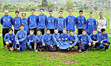 Eberbacher C-Jugend wurde mit Trainingspullover ausgestattet Auf dem Bild sind Betreuer Gunter Krauth, einige Spieler der beiden C-Jugend Mannschaften sowie Thomas Reibel (v.l.n.r.) (Foto:privat)