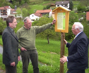 Odenwälder Original nach wie vor unvergessen V.l. Rothenbergs Bürgermeister Hans-Heinz Keursten, Initiator und Buchautor Rainer Türk und Landrat Horst Schnur, der Vorsitzende des Touristik-Service Odenwald-Bergstraße und des HessenTouristikService an einer der zehn Schautafeln am neuen Rundwanderweg. (Foto:privat)(tw) (kj) Der Rothenberger Ortsteil Raubach verdankt seine Bekanntheit seinem berühmten Sohn, dem "Raubacher Jockel" (bürgerlich Jakob Ihrig). Er war einer der Schelme mit jenem typischen schlitzohrigen Humor, den schon so manches Original ausgezeichnet hat, kurz, eine Art Till Eulenspiegel, der mit seinen Künsten und Streichen Anlass zu manch lustiger Erzählung gab. Im Jahre 1941 ist der Raubacher Jockel im Alter von 75 Jahren verstorben. Neben der Grabstätte auf dem Raubacher Friedhof sind seine lustigen Weisen und die vielen humorvollen Geschichten und Anekdoten geblieben, die schon zu Lebzeiten des Jockels und bis heute noch im Odenwald erzählt werden.