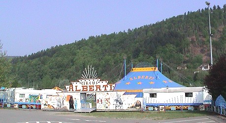Circus Alberti gastiert (Foto:Richter)(hr) Auf dem Festplatz in der Au hat der Circus Alberti seine Zelte aufgeschlagen. Er gastiert dort vom 8. bis 12.Mai. Als Hauptattraktion hat er den nach eigenen Angaben "größten dressierten Elefantenbullen Europas" dabei.