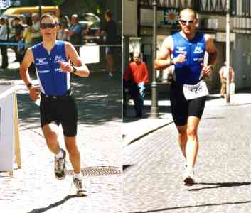 Oliver Stoll behauptete sich bei den besten Nachwuchs-Duathleten, Klassensieg für Boris Müller Oliver Stoll(li.) und Boris Müller auf der Laufstrecke. (Fotos:privat)(tw) (bm)Hervorragende Ergebnisse konnten zwei Triathleten vom TV Eberbach im Niedersächsischen Bad Gandersheim erzielen. Für Oliver Stoll war dort die Auftaktveranstaltung für die "German Duathlon Series". Bei dieser Serie werden die besten nationalen Nachwuchs-Duathleten ermittelt. Bei den insgesamt fünf Veranstaltungen besteht für die Teilnehmer die Möglichkeit sich für die Nationalmannschaft zu empfehlen, und bei entsprechenden Ergebnissen an Europa- und Weltmeisterschaften teilzunehmen. Dementsprechend stark präsentierte sich dort auch das Teilnehmerfeld, das fast ausnahmslos mit Kaderathleten besetzt war. Sein Trainer Boris Müller nutze die lange Anreise um am 4. Bad Gandersheimer Duathlon über die Kurzdistanz teilzunehmen, bei dem parallel die Niedersächsischen Landesmeisterschaften ausgetragen wurden. Eine tolle Atmosphäre erwartete die beiden TVE-Akteure in der Altstadt von Bad Gandersheim. Bei Temperaturen um die 25 Grad, Live-Musik und einem ausgezeichnet organisiertem Wettkampf herrschte eine ausgelassene Stimmung. Diese wurde durch eine Samba-Gruppe mit ihren Schlagzeugen noch angeheizt. Gleich im ersten Wettkampf des Tages startete Oliver Stoll. Er musste sich über die Distanz von 2,2 Kilometer Laufen, 14 Kilometer Radfahren und nochmals 2,2 Kilometer Laufen gegenüber seiner Konkurrenz behaupten. Beim ersten Laufabschnitt mussten zwei Runden in der Altstadt zurückgelegt werden. Nach der ersten Runde konnte sich Oliver Stoll in einer vierköpfigen Spitzengruppe vom Rest des Feldes absetzen. Mit einer Laufgeschwindigkeit von 20 km/h erreichten sie nach nur 6:44 Minuten die Wechselzone, wo die Athleten so schnell als möglich vom Laufen zum Radfahren wechseln mussten. Gleichzeitig gingen die vier Athleten wieder auf die 14 Kilometer lange Radstrecke. Mit dem anspruchsvollen Streckenverlauf kam Oliver Stoll sehr gut zurecht. Auch hier wurde das Tempo extrem hoch gehalten, so das sich keiner entscheidend absetzen konnte. Mit einem Durchschnitt von 37 km/h erreichte das Führungsquartett nach nur 22 Minuten Fahrzeit wieder die Wechselzone. Jetzt hieß es wieder Rad abstellen, Radschuhe ausziehen, und wieder rein in die Laufschuhe. Etwa 8 Sekunden länger als seine drei Konkurrenten benötigte Oliver Stoll hier. Damit verlor er wertvolle Meter und ging als vierter auf die abschließende Laufstrecke. Angefeuert durch die zahlreichen Zuschauer, blieb das Rennen bis zum Schluss Spannend, da alle vier noch dicht zusammen waren. In der Reihenfolge änderte sich aber bis zum Ende des Rennens nichts mehr. Mit einer Laufzeit von nur 7 Minuten überquerte Oliver Stoll nach nur 36 Minuten die Ziellinie. Damit belegte er einen fantastischen 4. Platz. Mit dieser tollen Leistung machte er den anwesenden Nationaltrainer auf sich aufmerksam, der bei den folgenden Wettkämpfen wohl ein genaueres Auge auf den 17-jährigen Waldbrunner werfen wird. Die nächste Veranstaltung in dieser Serie findet am 18. Mai in Viernheim statt, wo auch die Deutschen Meisterschaften im Duathlon ausgetragen werden. Wenn sich Oliver Stoll dort auch wieder in einer so tollen Form präsentieren kann, darf man auf das Ergebnis gespannt sein. Beim zweiten Wettkampf des Tages war Boris Müller mit am Start. Hier war eine Distanz von 4,4 Kilometer Laufen, 26 Kilometer Radfahren, und nochmals 4,4 Kilometer Laufen zurückzulegen. Die Teilnehmer der Niedersächsischen Meisterschaften wurde in einer eigenen Wertung aufgenommen, so das Boris Müller in seiner Klasse nicht mit einer so starken Konkurrenz kämpfen musste. Die ersten vier Laufrunden ging er zurückhaltend an, konnte aber bereits nach 18 Minuten zum Radfahren wechseln. Auf der Radstrecke wurde wie auch wie im vorhergehenden Wettkampf ein sehr hohes Tempo gefahren. Auf dem hügeligen Parcours, bei dem Steigungen von bis zu 12 Prozent zu bewältigen waren konnte er aber sich aber noch 10 Positionen nach vorne schieben, und erreichte nach nur 48 Minuten wieder die Wechselzone. Beim abschließenden Lauf konnte er Runde für Runde Plätze gut machen und beendete mit einer Gesamtzeit von 1:25 Stunden an 9. Position das Rennen. In seiner Altersklasse belegte er mit dieser sehr guten Leistung den ersten Platz. Erschöpft, aber sehr zufrieden mit den erbrachten Leistungen traten beide Athleten nach der Siegerehrung die Heimreise nach Eberbach an. Viel Zeit zum Ausruhen bleibt allerdings nicht, da für Oliver Stoll bis zur ersten Juni-Woche fünf Wettkämpfe auf dem Plan stehen. Weitere Informationen über die Arbeit der