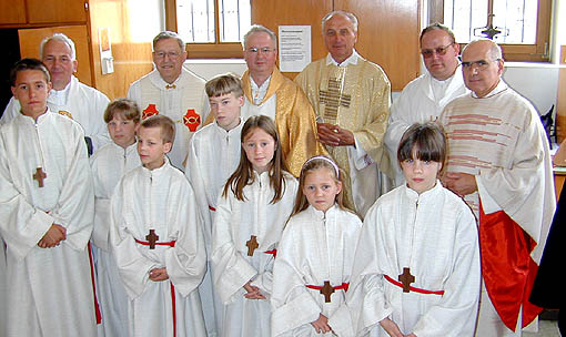 Für mich ist Christus das Leben Pater Kasimir Fieden von der "Missionaren der Heiligen Familie" feierte heute in Strümpfelbrunn sein 25jähriges Priesterjubiläum. Unser Foto zeigt Pater Kasimir Fieden (4.v.r.) zusammen mit den Pfarrern Wolfgang Hemker (rechts), Hubert Seitz (2.v.l.), Prof. Joachim Piegsa (3.v.r.) sowie seinen polnischen Ordensbrüdern Pater Alxander Helios und Georg Lapinskin und den Ministranten der Pfarrkirche St. Maria. (Foto: Baumgartner)(tb) Mit einem Festgottesdienst feierte Pater Kasimir Fieden von den „Missionaren der Heiligen Familie“ (MSF) am Sonntag in Waldbrunn-Strümpfelbrunn seine 25jähriges Priesterjubiläum. Zu Ehren des beliebten Priesters der katholischen Pfarrei St. Maria sang der Kirchenchor dabei die "Missa Brevis" von Wolfgang Amadeus Mozart. Im Beisein von Bürgermeister Klaus Schölch und zahlreichen Vertretern des öffentlichen Lebens der Gemeinde Waldbrunn hielt Professor Joachim Piegsa (MSF) von der Universität Augsburg die Festpredigt zum Festgottesdienst, den die Priesterkollegen Hubert Seitz (Eberbach), Wolfgang Hemker, sowie Pater Georg Lapinskin und Alexander Helios, der in diesem Jahr auch sein silbernes Priesterjubiläum feiert, von den "Missionaren der Heiligen Familie" aus Polen.