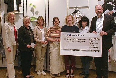 Verspätetes Osterei für Kindergärten (Foto:C.Richter)(hr) (cr) Dank einer Osteraktion im Eberbacher Modehaus Müller kamen dieser Tage die Eberbacher Kindergärten zu einem nachträglichen Osterei. Sigrid Müller-Götz und Dietrich Müller überreichten den Kindergärten einen Symbolscheck in Höhe von 1.110 Euro, also für jede Einrichtung 220 Euro. Die anwesenden Vertreterinnen der Kindergärten freuten sich über die Geldspritze. Unser Bild zeigt v.l. Sigrid Müller-Götz, Ulrike Kraus, Ingrid Schuh, Ute Wieder, Claudia Rupp, Carmen Schreiber-Sohns und Dietrich Müller.
