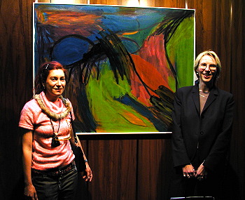 Berit Haberkorn - Ausstellung in der Volksbank eröffnet Berit Haberkorn (l.) und Dr. Dorothee Höfert vor einem Werk der Karlsruher Malerin. (Foto:A.Claussen)(jc) Gestern wurde in der Eberbacher Hauptstelle der Volksbank Neckartal die Austellung "Berit Haberkorn – Malerei" vom Vorsitzenden des Vorstandes der Bank, Herbert Hinterschitt, eröffnet.