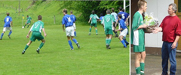 Freiensteiner behielten mit 2:1 die Oberhand Dennis Hemberger in Aktion - Dennis Hemberger wird ein Abschiedspräsent überreicht. (Fotos:privat)(bro) (rj) Zu einem verdienten Sieg kam der SV Gammelsbach am vergangenen Sonntag gegen den abstiegsbedrohten TSV Hainstadt. Im letzten Heimspiel behielten die Freiensteiner mit 2:1 die Oberhand. Gleich nach Anpfiff vom SR Schweickhardt (Auerbach) zeigte sich die Heimmannschaft agiler und kontrollierte die Partie. Der unter Zugzwang stehende TSV reagierte nur und ließ das erwartete Engagement gänzlich vermissen. So kam es dann auch zum 1:0 für die Platzherren, das erfreulicherweise der zum Saisonende scheidende Dennis Hemberger mit einem sehenswerten Distanzschuss erzielte. So wurden auch die Seiten gewechselt.
