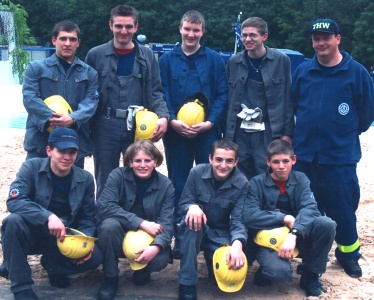 THW-Eberbach war mit einer Mannschaft und vier Schiedsrichtern vertreten Das Eberbacher Wettkampfteam. (V.l.)Daniel Salzmann, Daniel Müller, Tobias Nava, Patrick Bräunlin, Matthias Hodbod (Jugendgruppenleiter). Vordere Reihe: André Eschenbach, Stefanie Müller, Lars Müller, Alexander Nava. (Foto:privat)(tw) (as) Am vergangenen Sonntag fand der Landesjugendwettkampf der THW- Jugend Baden Württemberg auf dem Gelände des Technischen Hilfswerk Göppingen statt. Eine der 18 Mannschaften aus 16 verschieden Ortsverbänden war die Jugendgruppe aus Eberbach. Eine Gruppe bestand jeweils aus 10 Junghelfern im Alter von 10-18 Jahren. Die Jugendbetreuer Matthias Hodbod und Annika Kaidel waren mit ihrem Wettkampfteam nach Göppingen gereist. Daniel Salzmann, Daniel Müller, Tobias Nava, Patrick Bräunlin, André Eschenbach, Stefanie Müller, Lars Müller und Alexander Nava behaupteten sich und belegten den 9. Platz. Auch die vier Schiedsrichter Thomas Kappes, Timo Münch, Maic Heckmann und Achim Link waren für den Wettkampf aus Eberbach angereist. Die Hauptaufgabe des Wettkampfes bestand darin, ein Teilstück eines Tonnenstegs oder auch als Schwimmender Wassersteg bezeichnet, zu bauen und mit den Nachbargruppen zu einem langen Steg zu verbinden. Für diese Aufgabe errichteten die Göppinger THW´ler ein 70 Meter langes, 3 Meter breites und 80 cm hohes Wasserbecken. Insgesamt flossen über 150 Kubikmeter Wasser in das Wasserbecken bevor der Wettkampf beginnen konnte. Als eine weitere Aufgabe musste ein Kriechgang bewältigt werden. Die Jugendlichen mussten dazu mit einem Auffanggurt gesichert werden, eine Mauer durchbrechen und die versperrenden Teile beiseite räumen. Am Ende des Ganges befand sich ein Verletzter dem Erste Hilfe geleistet werden musste. Mit einer sogenannten Bergeschleppe sollte er fachgerecht aus der Schadensstelle gebracht werden. Des Weiteren sollten die Gruppen 50 Sandsäcke füllen und mit 150 weiteren ein großes Wasserauffangbecken bauen. Mit Hilfe einer Tauchpumpe und eines Stromerzeugers musste dieses Becken befüllt werden. Für die Aufgaben wurden viele Materialien benötigt. Unter anderem rund 1,5 Kilometer Holz, 2000 Nägel, 4000 Sandsäcke, 1,5 Kilometer Schnur und 5 Kilometer Leinen. Der Wettkampf wurde begleitet vom Rahmenprogramm der 50-Jahr-Feier des THW-Ortsverbands Göppingen und dem 25 jährigen Jubiläum der Jugendgruppe. Bereits Samstags begann die Veranstaltungsreihe mit einer großen Beachparty auf mehreren Tonnen Sand. Neben Verpflegung wurden die Besucher mit Live Musik verwöhnt. Es fand eine große Fahrzeugschau statt und eine Einsatzschauübung mit einem Rettungshubschrauber. Unter den Gästen befanden sich viele Ehren- und Hauptamtliche Mitarbeiter des Technischen Hilfswerk, der Feuerwehr, der Erste Hilfe Organisationen und der Polizeidirektionen aus ganz Baden Württemberg. Auch Ute Vogt, parlamentarische Staatssekretärin im Innenministerium und Ehrenpräsidentin der THW Jugend Baden- Württemberg, verfolgte den spannenden Wettkampf genauso wie Landesbranddirektor Ulrich Kortt und Landtagsvizepräsident Frieder Birzele. Die Siegermannschaft Göppingen vertritt die THW-Jugend Baden Württemberg nächstes Jahr am Bundesjugendwettkampf der im Sommer 2004 im Rahmen des Bundeslagers im Baden-Württembergischen Münsingen statt finden wird.