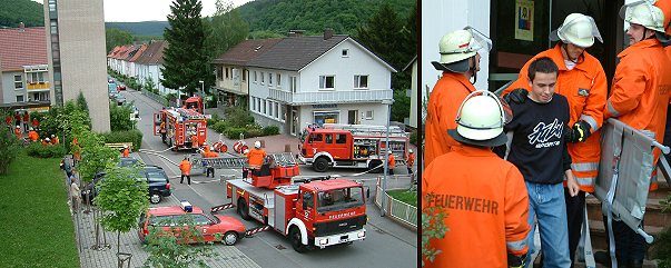 Küchenbrand und sieben vermisste Jugendliche in der Unterkirche Blick auf den Löschzug der Freiwilligen Feuerwehr. Einige Feuerwehrleute bringen einen leicht verletzten Jugendlichen ins Freie. (Fotos:Wörner)(tw) (bs) Eine Einsatzübung veranstaltete die Freiwillige Feuerwehr Eberbach am Dienstagabend in der Unterkirche von St. Josef in Eberbach-Nord unter Mithilfe der dortigen Ministranten. Angenommen wurde ein Küchenbrand mit sieben vermissten Jugendlichen. Die Feuerwehr rückte mit ca. 30 Feuerwehrkräften, mit einem Löschzug, bestehend aus vier Fahrzeugen, an. Den Einsatz leitete Lothar Zimmermann, Stadtbrandmeister Jörg Kubein war als Einsatzbeobachter tätig. Die Übung wurde von Marc Schneider und Patrick Laick vorbereitet. Das Planspiel umfasste ein realistisches Szenario mit ausströmendem Gas und starker Rauchentwicklung. Die Übung dauerte über 30 Minuten, hierbei wurde das gesamte Material eines Löschzuges eingesetzt.