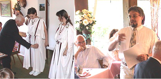 Kulturhistorische Erlebnisgastronomie im Neckarblick Hans Klinge erläutert die Kleidung der Römerinnen, rechts Dr.Rüdiger Lenz bei seinem Vortrag über die Römer in Eberbach und Umgebung. (Fotos:Richter)(hr) Im Hotel Neckarblick am Breitenstein sind die "Römertage" zu Ende gegangen. Seit 9. Mai hatte man sich an drei Vortragsabenden (jeweils freitags) über die Geschichte der Römer in der damaligen Provinz Germanien und der Region um Eberbach informieren können. Referenten waren Prof.Dr. Reinhard Stupperich, Manfred Waltereit vom Historischen Verein "Elantia" aus Neckarburken und gestern abend der Eberbacher Stadtarchivar Dr.Rüdiger Lenz, der im voll besetzten Restaurant zunächst das Römische Reich in den ersten Jahrhunderten nach Christus skizzierte und dann auf die Spuren zu sprechen kam, die die Römer in der hiesigen Region hinterlassen haben. In Eberbach selbst sind diese eher spärlich, denn die Hauptrouten vom römischen Zentrum Lopodunum (das heutige Ladenburg) an den Limes verliefen weiter südlich über Lobenfeld und Obrigheim nach Neckarburken. Allerdings vermutete der Archäologe und Limesforscher Karl Schumacher einen Römerweg von Eberbach entlang des Holderbachs nach Oberdielbach und weiter über Strümpfelbrunn, Mülben und Wagenschwend zum in Nord-Süd-Richtung verlaufenden Kolonnenweg - diese Verbindung ist aber nicht wissenschaftlich belegt.