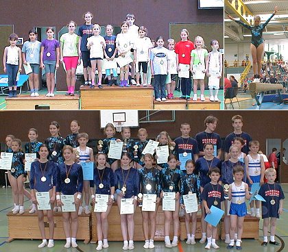 Vereinsmeisterschaften des TV Eberbach Links oben die Bestplatzierten der Allgemeinen Klasse, unten die ersten bis dritten Sieger der Fördergruppe. (Fotos:Richter)(hr) Gestern ermittelten die Turnerinnen und Turner des TV 1846 Eberbach in der Ittertal-Sporthalle ihre Vereinsmeister. Geturnt wurde in zwei Durchgängen, zunächst in der Allgemeinen Klasse, wo die Kleinen auch ihre Spielturnabzeichen bzw. Kinderturnabzeichen erwarben. Später zeigten dann die Jungen und Mädchen der Fördergruppe ihr Können an den Geräten.