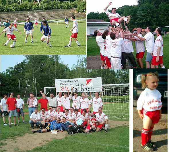 Auch die zweite Halbzeit brachte keine Veränderung am Spielverlauf. Inter Erbach konnte nicht mehr und die Kailbacher spielten aus einem Guß munter der Meisterschaft entgegen. In der 46. Minute kam F. Bachl frei von Halbrechts zum Schuss, scheiterte allerdings zu unpräzise am Inter Torwart. In der 62. Minute traf dann A. Graf mit einem herrlichem Kopfball zum dritten Mal nur die Querlatte des Inter Tores. So dauerte es bis zur 73. Minute ehe S. Schmidt nach einer traumhaften Flanke von Resul Tekin per Kopf das 3:0 erzielte. Keine Minute später setzte sich abermals der Mann des Tages S. Schmidt auf der rechten Außenbahn schön durch - seine hohe Flanke verwertete dann ein Inter Spieler per Kopf zum gefeierten 4:0 für die ISV. In der 79. Minute hatte dann F. Bachl die letzte hundertprozentige Torchance der Kailbacher, als er einen zu kurzen Rückpass erlief, den Ball dann allerdings nicht im Inter Gehäuse unterbringen konnte. Pünktlich um 16.44 Uhr erfolgte dann der ersehnte Abpfiff und der Beginn der Meisterzeit bei der ISV Kailbach. Im Autotorso ging es dann zurück ins Ittertal, in dem noch zu früher Morgenstunde die Schlachtgesänge der Kailbacher Spieler und Fans zu vernehmen waren.