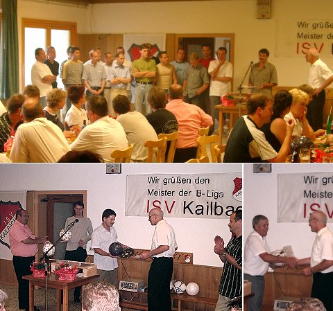 (lf) Am gestrigen Freitag feierte die ISV Kailbach ihre erfolgreich geführte Runde in den B-Liga Odenwaldkreis, in der sie verdient als Meister hervorging. Meister-Trainer Toni Rippberger stellte die Mannschaft vor und resümierte nochmals über die abgeschlossene Runde. Zu diesem Anlaß waren auch Vertreter aus den Nachbargemeinden und den umliegenden Vereinen eingeladen. Sie überbrachten ihre Glückwünsche und überreichten dem Verein eine Sach- oder Geldspende.