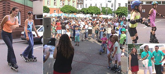 Video ansehen(hr) Rund 120 Rollergirls und -boys nutzten heute Nachmittag die Gelegenheit, auf insgesamt rund 1.000 kleinen Rollen nach Herzenslust durch die autofreie Eberbacher Innenstadt zu skaten. Um 16 Uhr gab Claudia Hülsen vom Stadtjugendring, der die Veranstaltung organisiert hatte, den Anpfiff zum 1.Eberbacher Inliner-Event. Hinter einem Polizeimotorrad und einem VW Beetle als Leitfahrzeuge setzte sich der Pulk der Inline-Skater in Bewegung. Bis 18.30 Uhr konnte man seine Runden drehen. Dann gab es bei zwei Gewinnspielen von AOK und Stadtjugendring noch zahlreiche Sachpreise und Gutscheine zu gewinnen. Auf dem Leopoldsplatz sorgte DJ Christian Gerbig für Musikunterhaltung. Turnverein, Pfadfinder Silberreiher, Handballgesellschaft und Evangelische Jugend bewirteten Teilnehmer und Zuschauer. Auch ein Geschicklichkeitsparcours für Skater und Rollerblader war aufgebaut.