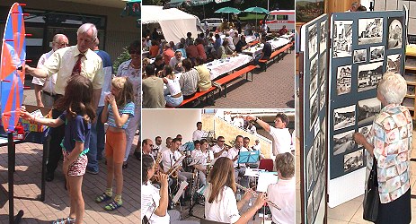 Bis zum Nachmittag bevölkerten zahlreiche Festbesucher den Platz, auf dem die Hirschhorner Pfadfinder Zelte zum Schutz vor der heißen Sonne aufgebaut hatten. Ihnen kommt auch der Erlös des Bratwurstverkaufs zu Gute, der - ebenso wie die Ausgabe kostenloser Getränke - von den MGV-Chören Hirschhorn übernommen wurde. Zur musikalischen Unterhaltung spielte die Katholische Kirchenmusik. Wer den richtigen Dreh am Glücksrad ´raus hatte, konnte Gutscheine für Schifffahrten auf dem Neckar gewinnen. Für die Kids gab es Luftballon-Figuren und ein "Formel-1" - Computer-Gewinnspiel. In den Bankräumen war eine Foto-Ausstellung über Hirschhorn in den vergangenen 100 Jahren aufgebaut, und wer Lust hatte, konnte sich einen "Geburtstagsspiegel" mit vielen Informationen rund um sein Geburtsdatum ausdrucken lassen.