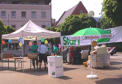 AOK-Radsonntag erstmals auch in Eberbach Start und Ziel der Radtouren war der AOK-Stand auf dem Leopoldsplatz. (Foto:Richter)(hr) Seit 1994 führt die AOK Baden-Württemberg alljährlich am Aktionstag "Mobil ohne Auto" ihren "Radsonntag" durch. Am gestrigen "autofreien" Sonntag beteiligte sich erstmals auch die AOK Eberbach an der Aktion. Ausgehend vom Leopoldsplatz waren drei verschiedene Strecken eingerichtet: eine Familientour von 22 km Länge über Allemühl nach Schwanheim und zurück, eine 16 km lange Kindertour bis Allemühl und zurück sowie eine große Neckar-Elsenz-Route (75 km über Schönbrunn - Lobbach - Meckesheim - Zuzenhausen - Eschelbronn - Epfenbach - Reichartshausen - Aglasterhausen - Breitenbronn - Neckarkatzenbach - Neunkirchen - Schwanheim - Eberbach).