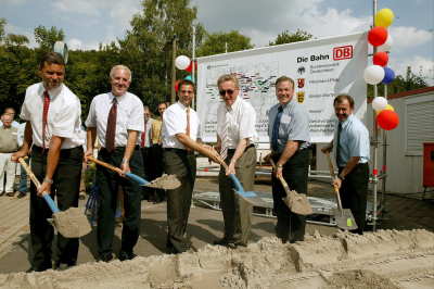 Baubeginn in Zwingenberg, Neckargerach und Binau V.l:Detlef Piepenburg, Peter Kirchesch, Peter Hauk, Dr. Wolfgang Wagner, Peter Keller, Egon Scheuermann. (Foto:VRN)(jc) (vrn) Mit dem heutigen symbolischen Spatenstich in Neckargerach durch Egon Scheuermann, Bahnhofsmanagement Heidelberg der Deutschen Bahn AG, Detlef Piepenburg, Landrat des Neckar-Odenwald-Kreises, Peter Kirchesch, Bürgermeister der Gemeinde Neckargerach und Zwingenberg, Peter Keller, Bürgermeister der Gemeinde Binau, und Dr. Wolfgang Wagner, Geschäftsführer der Verkehrsverbund Rhein-Neckar GmbH, werden die Umbaumaßnahmen für weitere drei Stationen der künftigen S-Bahn Bahn RheinNeckar eingeleitet: Bis zum Start am 14. Dezember 2003 werden die Stationen Neckargerach, Zwingenberg und Binau fit gemacht für die neuen S-Bahn-Fahrzeuge.
