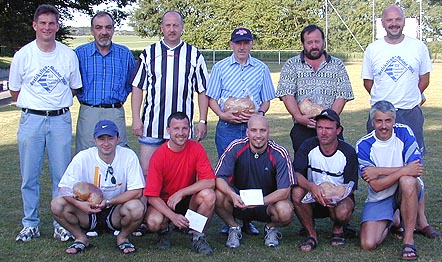 Faire und spannende Spiele Unser Foto zeigt die Spielführer der Siegreichen Mannschaften zusammen mit Vorstand Hermann Döring (stehend links.) und Ortsvorsteher Werner Braun (stehend, 2.v.l).