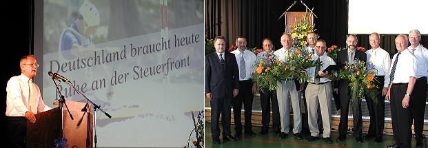 Gutes Ergebnis ermöglicht sechs Prozent Dividende Herbert Hinterschitt bei seinen Ausführungen sowie Ehrung dreier Aufsichtsräte (v.l.:) Dietrich Herold, Friedrich Heuser, Günter Michel, Horst Ludwig, Ekkehard Saueressig, Helmut Leibfried, Franz Fuchs, Herbert Hinterschitt, Robert Moray und Wilfried Herbold (Fotos:Claussen)(jc) Genau 150 Vertreterinnen und Vertreter der Volksbank Neckartal trafen sich gestern in der Wiesenbacher Biddersbachhalle zur diesjährigen ordentlichen Vertreterversammlung.