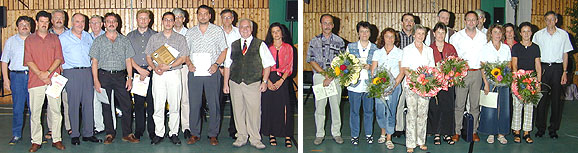 Zahlreiche Ehrungen beim Festbankett Beim Festbankett anläßlich des 25jährigen Bestehens der Sportgemeinschaft Waldbrunn wurden auch Gründungsmitglieder geehrt. Unser linkes Foto zeigt sie zusammen mit dem 1. Vorsitzenden Rainer Ihrig (re.) und der 2. Vorsitzenden Heike Krämer (3.v.re.). Auch gab es vom Tischtenniskreis Mosbach Ehrungen für langjährige aktive Spielertätigkeit. Unser rechtes Foto zeigt sie zusammen mit dem Vorsitzenden des Tischtenniskreis Mosbach, Peter Gangl (2.v.re.), Kreissportwart Klaus Konrad (li.), 1. Vorsitzenden Rainer Ihrig (3.v.re.) und der 2. Vorsitzenden Heike Krämer (re.), sowie Tischtennis-Abteilungsleiter Steffen Geier (6.v.re.). (Fotos: Baumgartner)
