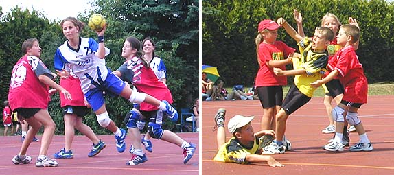 Kein Zentimeter Raum wurde preisgegeben Obwohl nur Handball-Freundschaftsspiele auf dem Spielplan beim 25-jährigen Jubiläum der SG Waldbrunn standen, wurde zum Teil auch bei den Kleinsten verbissen gefightet. (Fotos:Baumgartner)(tb) Die Sportgemeinschaft Waldbrunn feierte dieses Wochenende ihr 25-jähriges Bestehen. Nachdem sich mit einem bunten Programm in der Schulturnhalle der Winterhauchschule einige Abteilungen vorgestellt hatten, zeigte die Handballabteilung samstags und heute ihr Können. Dabei standen u.a. zahlreiche Jugendspiele auf dem Kleinfeldplatz an der Winterhauchschule auf dem Programm. Zu Gast waren dabei Mannschaften aus Steinsfurt, Eberbach und aus Ober-Hilbersheim (Rheinhessen). Mit der TSG Ober-Hilbersheim pflegen die Waldbrunner seit einigen Jahren freundschaftliche Kontakte und hatten beim Jubiläumsfest rund 150 kleine und große Handballer zu Besuch. Untergebracht waren die Gäste rund um das Gelände des Tennisclubs Waldbrunn und in dessen Vereinsheim. Nach einem gemeinsamen Mittagessen in der Sporthalle traten die Gäste dann noch heute den Heimweg an.