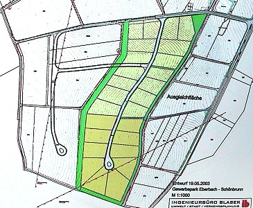 Zurückhaltendes Interesse an Gewerbeflächen in Schönbrunn - Bebauungsplan deutlich kleiner Rund auf die Hälfte zusammengeschrumpft ist das GIP-Plangebiet in Schönbrunn (farblich angelegt). Ursprünglich sollte der westliche Bereich (links im Bild) gleich mitbeplant werden. Die Erschließung bleibt jedoch über eine Stichstraße wie vorgesehen. (Repro:Richter)(hr) Nach dem Schönbrunner Gemeinderat in der vergangenen Woche (wir berichteten) haben heute auch die Eberbacher Ratsmitglieder die Aufstellung des Bebauungsplans für das interkommunale Gewerbegebiet "GIP" in Schönbrunn beraten und sich für eine deutlich kleinere Planfläche als bisher ausgesprochen. Bürgermeister Bernhard Martin betonte, das "GIP" sei ohnehin nur zur Deckung des örtlichen gewerblichen Bedarfs konzipiert und nicht vergleichbar mit Gewerbeparks wie auf der Asbacher Höhe zwischen Aglasterhausen und Obrigheim, wo auch überregional Investoren gesucht werden.