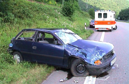 Mehrfacher Überschlag auf der Bundesstraße (Foto:Richter)(hr) Pech hatte heute gegen 18.30 Uhr eine 24-jährige Eberbacherin. Sie fuhr mit ihrem Opel auf der B 37 von Eberbach in Richtung Lindach. In einer langen Linkskurve geriet sie aus noch ungeklärter Ursache nach rechts auf den Grünstreifen, schleuderte anschließend nach links über die Fahrbahn und überschlug sich an der Böschung der dortigen Bahnlinie mehrmals. Dabei zog sie sich leichte Verletzungen zu - der angelegte Sicherheitsgurt hatte Schlimmeres verhindert. Am Auto entstand Totalschaden.