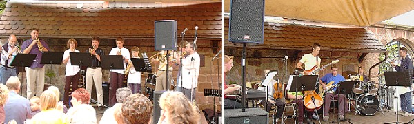 Verschiedene Ensembles der Musikschule Eberbach zeigten ihr Können Posaunenchor der ev. Kirche und Musikschule unter der Leitung von Wolfgang Brecht und das Basisensemble 2 unter der Leitung von Bernhard Sperrfechter, Leiter der Popularmusik (v.l.) (Fotos:Broghammer)(bro) Heute fand das diesjährige Musikschulfest nicht wie gewohnt auf dem Lindenplatz, sondern im Innenhof des Pulverturms statt. Umrahmt von einer malerischen Kulisse zeigten verschiedene Ensembles der Musikschule Eberbach ihr Können. Zahlreiche Besucher nutzten die Gelegenheit, sich von Tobias Soldner, Leiter der Musikschule, durch das Programm führen zu lassen. Für das leibliche Wohl sorgten der Elternbeirat, helfende Eltern sowie Lehrkräfte der Musikschule. Wer sich über die verschiedenen Fachbereiche der Musikschule informieren wollte, konnte sich an einem Info-Stand sachkundig beraten lassen. Auch die Kleinsten kamen an diesem Tag nicht zu kurz. Diese hatten die Gelegenheit, sich in einer Malecke künstlerisch zu betätigen.