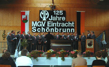 125 Jahre MGV 1878 Der Männergesangverein 1878 "Eintracht" Schönbrunn e.V. feierte gestern sein 125jähriges Bestehen. (Foto:Böhm) (ub) Auf den Tag genau 125 Jahre nach der Gründung feierte gestern der MGV Schönbrunn 1878 "Eintracht" sein 125-jähriges Bestehen mit einem Festbankett in der Schönbrunner Schulsporthalle (über diese Veranstaltung werden wir noch berichten).