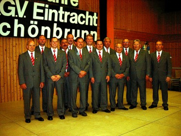 In Abwesenheit von Vertretern des Badischen Sängerbundes, die üblicherweise Ehrungen für 25, 40 und 50 Jahre Zugehörigkeit vornehmen, ergriff Vorsitzender Zimmermann kurzentschlossen selbst die Initiative. Ein Ehrenteller für 25 Jahre Mitgliedschaft im Verein wurde Karl Heiß, Harald Hilderhof und dem Vorsitzenden Erhard Zimmermann, überreicht. Mit der Ehrenmitgliedschaft zeichnete Zimmermann gestern Helmut Rudolf (Stimmführer im 2. Bass) und Werner Heiß (Träger der Vereinsfahne) für ihre 40jährige Zugehörigkeit zum MGV Schönbrunn aus. Mit einer Ehrung der besonderen Art wurden die Ehrungen gekrönt. Seit 1951 unterstützt Wilfried Braner im 2. Bass den Chor und wurde für sein 50jähriges Jubiläum geehrt.