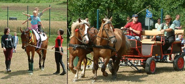 Gemütliches Fest mit abwechslungsreichem Rahmenprogramm Linkes Bild: Die Voltigiergruppe von Manuela Heiß(li.), Magalie Kley(re.) und Carolin Krejtscha bei ihrer Vorführung. Rechtes Bild: Ralf Lutzki mit dem Gespann von Björn Schmitt, der hier als Beifahrer dabei war, beim Fahrwettbewerb. (Fotos:Wörner)(tw) Am vergangenen Wochenende feierten die Eberbacher Reiter ihr traditionelles Reiterfest. Schon am Samstag kamen Reiter aus nah und fern nach Pleutersbach um sich auf dem umfunktionierten Bolzplatz im Geschicklichkeits-Trail zu messen. Gestern Nachmittag war der Bolzplatz dann Arena für eine ganze Reihe von Vorführungen. Bei gutem Besuch und strahlendem Sommerwetter gab zuerst eine Gruppe Reitschülerinnen eine beeindruckende Kostprobe ihres Könnens. Einen besonderen Applaus erhielten die beiden Voltigiergruppen. Mit ihren Trainerinnen Manuela Heiß, Carolin Krejtscha und Magalie Kley sowie Anna-Lena und Katharina Eberhard hatten die zum Teil Kleinsten des Reitvereins seit Wochen ihren Auftritt geprobt und mit Bravour gemeistert. Reiten in Vollendung zeigten dann Christine Renner, Julia Krejtscha, Magalie Kley und Manuela Heiß in ihrer Vorführung als "Schwarze Reiterinnen". Eine weitere Attraktion im Anschluss an die Vorführungen des Reitvereins war ein Wettbewerb im Gespannfahren, den Christian Vierling aus Reichartshausen bei den Einspännern und Hubert Schneider aus Dühren bei den Zweispännern für sich entscheiden konnten. Ein Highlight vor allem für kleine Festbesucher war das Ponyreiten. Für die Bewirtung ihrer Gäste sorgten wie immer die Vereinsmitglieder selbst. Im Laufe des Wochenendes konnte man auch etwa 80 Gäste die "Hoch zu Ross" gekommen waren auf dem Fest begrüßen.