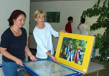 Unser Bild zeigt links Kunstlehrerin Andrea Kodeda-Weißmann und Martina Bussemer vom Krankenhaus bei der Vorbereitung der Ausstellung. Die Schau wird bis in den Herbst andauern.