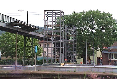 Stahlgerüste für Personenaufzüge am Bahnhof montiert (Foto:Richter)(hr) Es tut sich was am Bahnhof: Nachdem für die künftige S-Bahn seit Oktober 2002 bereits zwei Bahnsteige angehoben wurden, rückte heute ein Schwerlastkran an, mit dessen Hilfe die Stahlgerüste für die beiden Aufzüge zwischen den Bahnsteigen und dem Fußgängersteg montiert wurden. Die Fahrstühle sollen für eine behindertengerechte Anbindung der Bahnsteige sorgen. Sie werden Tag und Nacht in Betrieb sein und die Mitnahme von Fahrrädern gestatten. Der bisherige schienengleiche Überweg zwischen den Bahnsteigen 1 und 2 soll dann entfallen. Zusätzlich wird nach den derzeitigen Planungen am Bahnsteig 1 eine Wartehalle neu gebaut und die bestehende Überdachung auf dem Bahnsteig 2 mit Windfängen versehen.