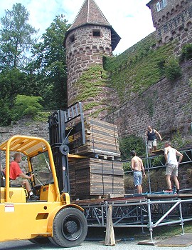Bühne für Schlossfestspiele steht (Foto:Schlossfestspiele)(hr) Die Bühne steht, die Sänger können kommen: Innerhalb eines Tages hat die Firma H + M Bühnenservice die "Bretter" für die Schlossfestspiele Zwingenberg aufgebaut. Das professionelle Team baut für die meisten großen Rockkonzerte und Tour-Theaterereignisse bundesweit die Bühnen. Im großen Innenhof von Schloss Zwingenberg war das Unternehmen mit acht Mann und entsprechendem Gerät bei der Arbeit. Tatkräftig helfen auch die Bauhöfe von Neckargerach, Zwingenberg, Waldbrunn, Schwarzach, Mosbach und Eberbach mit. Und auch für die Techniker der Schlossfestspiele selbst bleibt noch genug zu tun: Sie sind für das gesamte Bühnenbild und viele andere "Kleinigkeiten" vor und hinter der Bühne zuständig. Bei den Schlossfestspielen werden in diesem Jahr die Opern "Der Freischütz" von Carl Maria von Weber und "Hoffmanns Erzählungen" von Jaques Offenbach sowie die Operette "Der Bettelstudent" von Carl Millöcker aufgeführt. Die Proben dazu beginnen in diesen Tagen. Zudem gibt es wieder Matineen, Nachtkonzerte mit Franz Mazura und einen Opernnachmittag für Kinder. Weitere Informationen finden sich im Internet (Adresse s.u.). Karten und Auskunft gibt es auch im Festspielbüro Zwingenberg unter Telefon (06263) 771.