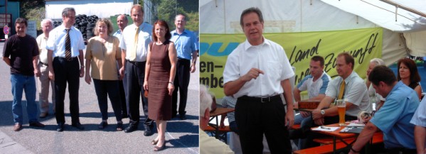 Finanzminister beim Eberbacher Wirtschaftsforum Ilhan Demirci, Hermann Bussemer, Finanzminister Gerhard Stratthaus, Ute Böhm, Willi Fischer, Rudi Joho, MdL Elke Brunnemer und Thomas Weschbach bei der Begrüßung. Stratthaus im Gespräch mit Bürgern beim ersten Eberbacher Wirtschaftsforum. (Fotos:Böhm)(ub) Der baden-württembergische Finanzminister Gerhard Stratthaus kam vorgestern nach Eberbach, um mit Unternehmen und Gästen aus der Region das Thema "Deutschland als Schlusslicht Europas - Wege aus der Strukturkrise" zu diskutieren.