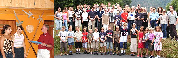 Sportlerehrung beim TV Eberbach Die Deutschen Meisterinnen Diana Celikel (l.) und Anna Vangone im Gespräch mit Janek Lange sowie alle Geehrten vor dem Turnerheim. (Fotos:Claussen)(jc) Beim TV Eberbach wurden heute die erfolgreichsten Aktiven der vergangenen Saison geehrt. Insgesamt 73 Sportlerinnen und Sportler erreichten ehrungswürdige Leistungen und bekamen eine Einladung ins Turnerheim. Aus den Händen der Vorsitzenden Gisela Fleck, Wolfgang Grimme und Janek Lange konnten sie ein Erinnerungsglas mit Gravur entgegennehmen. Herausragend war dabei zum wiederholten Male die Prellballabteilung. Die weibliche A-Jugend wurde Deutscher Meister und spielt in der kommenden Saison in der Bundesliga. Aber auch andere Abteilungen konnten wieder Meistertitel und gute Platzierungen auf Kreis-, Bezirks- oder Landesebene verzeichnen. So schafften beispielsweise die Volleyballherren den Wiederaufstieg in die Oberliga und die Damen den zweiten Aufstieg in Folge. In den Einzelsportarten erfreut die Vereinsverantwortlichen besonders die jüngste Abteilung, das Triathlon-Team, das regelmäßig mit guten Leistungen aufhorchen lässt sowie der breitgestreute Nachwuchs bei den Turnerinnen und Turnern.