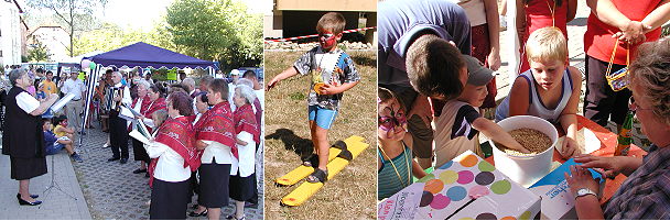 Großes Sommerfest der Beratungsstelle für Spätaussiedler (Fotos:Claussen)(jc) Heute veranstaltete die Beratungsstelle für Spätaussiedler – Stadtteilbüro Steige um die Wohnanlagen der Baugenossenschaft in der Unteren Talstraße ein großes Sommerfest. Mit deutscher und russischer Bewirtung und einem Kinderunterhaltungsprogramm, an dem über 60 Kinder verschiedenster Nationalitäten teilnahmen, erfreute sich das Fest, das im nächsten Jahr eine Neuauflage erfahren soll, großen Zuspruchs. Höhepunkt war der Auftritt des Aussiedlersingkreises in Leimen, der deutsches und russisches Liedgut vortrug. Die Mitarbeiter der Beratungsstelle hoffen, dass in naher Zukunft auch in Eberbach ein ähnlicher Singkreis oder Chor entstehen kann.